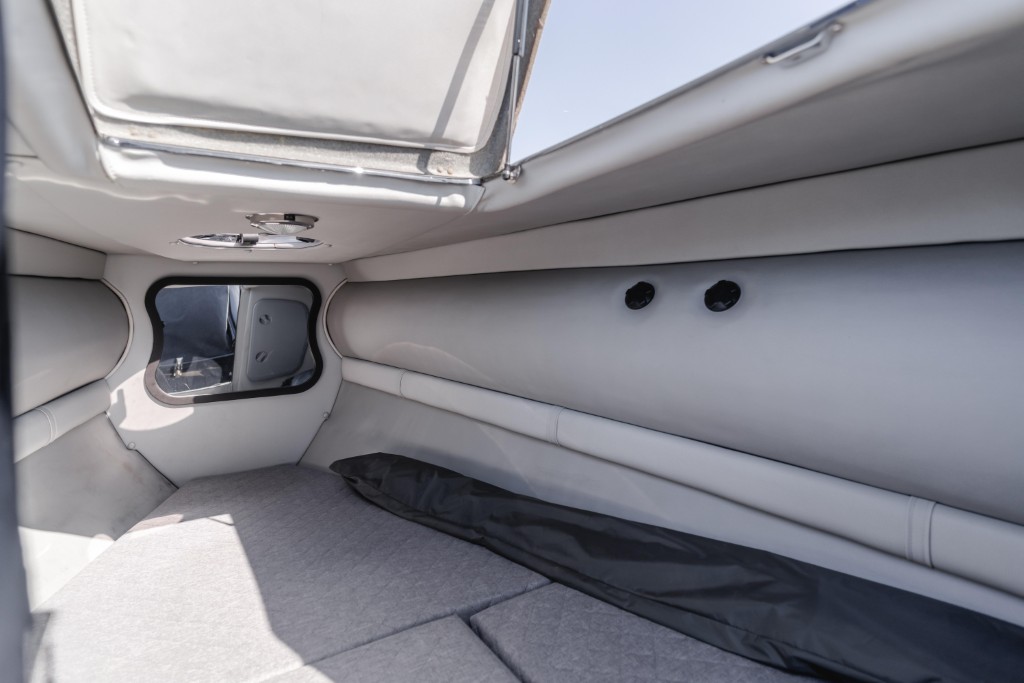 Cuddy cabin with nap space and pop-up head — adds convenience for longer days on board.